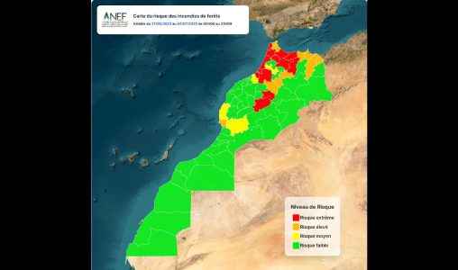 Ainsi, pour la période allant du 27 juin au 24 juillet et « après analyse des données relatives notamment à la nature des formations forestières et leurs niveaux de combustibilité et d’inflammabilité, et aux conditions topographiques et climatiques », l’ANEF annonce avoir repéré un risque extrême (niveau rouge) dans les provinces de Tanger-Assilah, Ouezzane, Larache, Chefchaouen, Taza, Taounate, Al Hoceima, Kénitra, Béni Mellal, Azilal, Skhirate-Témara, Salé, Rabat et Khémisset.
