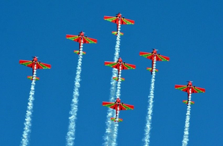 Le spectacle aérien a également inclus une série de figures individuelles, en duo et en groupe, telles que « la boucle double » et « le passage bas », réalisé avec tous les appareils reliés par une cordelette, un haut fait que seule l’équipe de la « Marche Verte » est capable de réaliser, ainsi que « la boucle en miroir », qui a valu à cette formation de figurer, depuis des années, dans le livre Guinness des records.